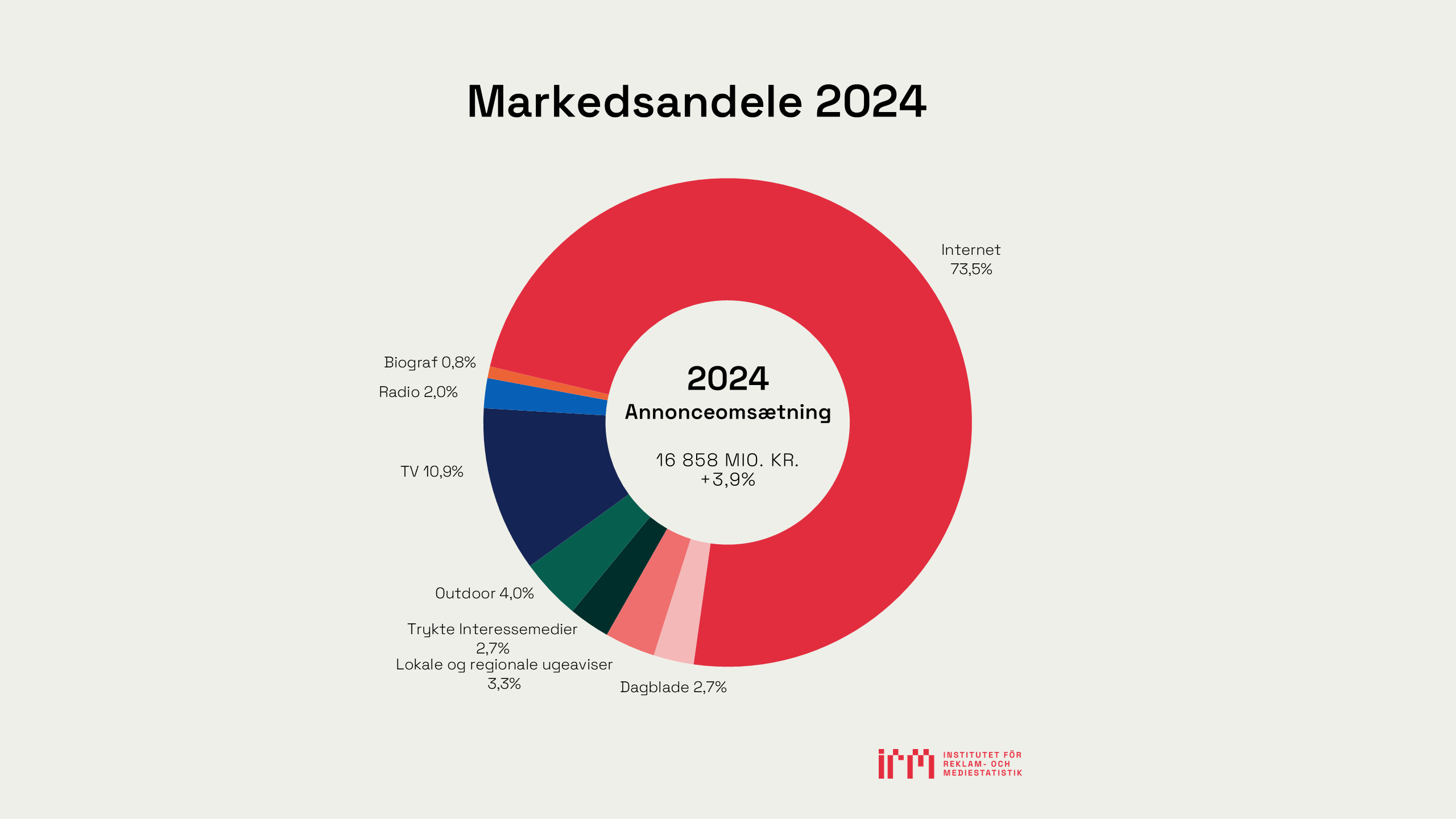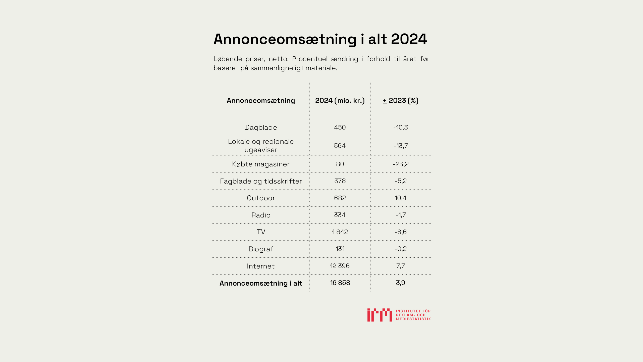 Reklameomsætning netto er ekskl. moms, provision og produktion. Nettoinvesteringer er egnet til at analysere udviklingen af det samlede reklamemarked og individuel reklame.